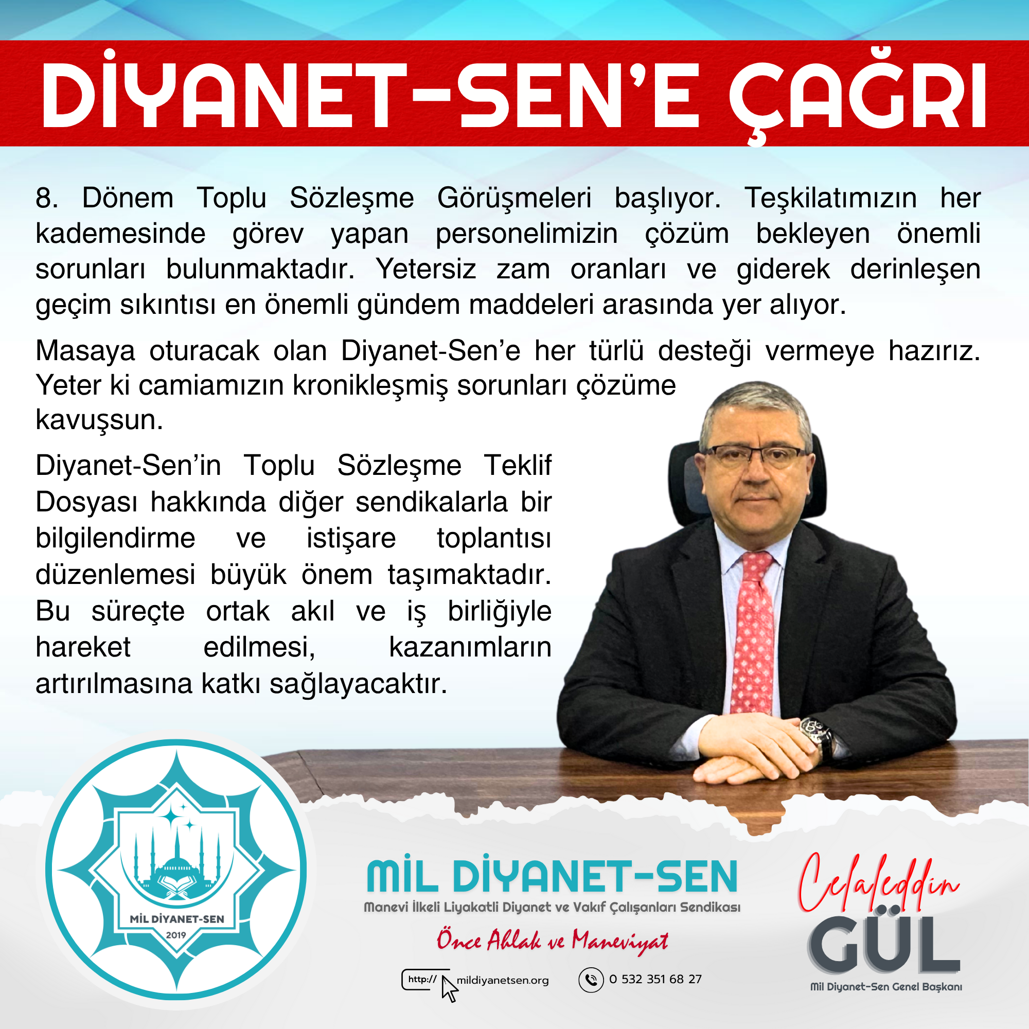 8. Dönem Toplu Sözleşme Görüşmeleri başlıyor. Diyanet teşkilatının her kademesinde görev yapan personelimizin çözüm bekleyen önemli sorunları bulunmaktadır. Memurlara yapılan yetersiz zam oranları ve giderek derinleşen geçim sıkıntısı, bu görüşmelerin en önemli gündem maddeleri arasında yer almalıdır.