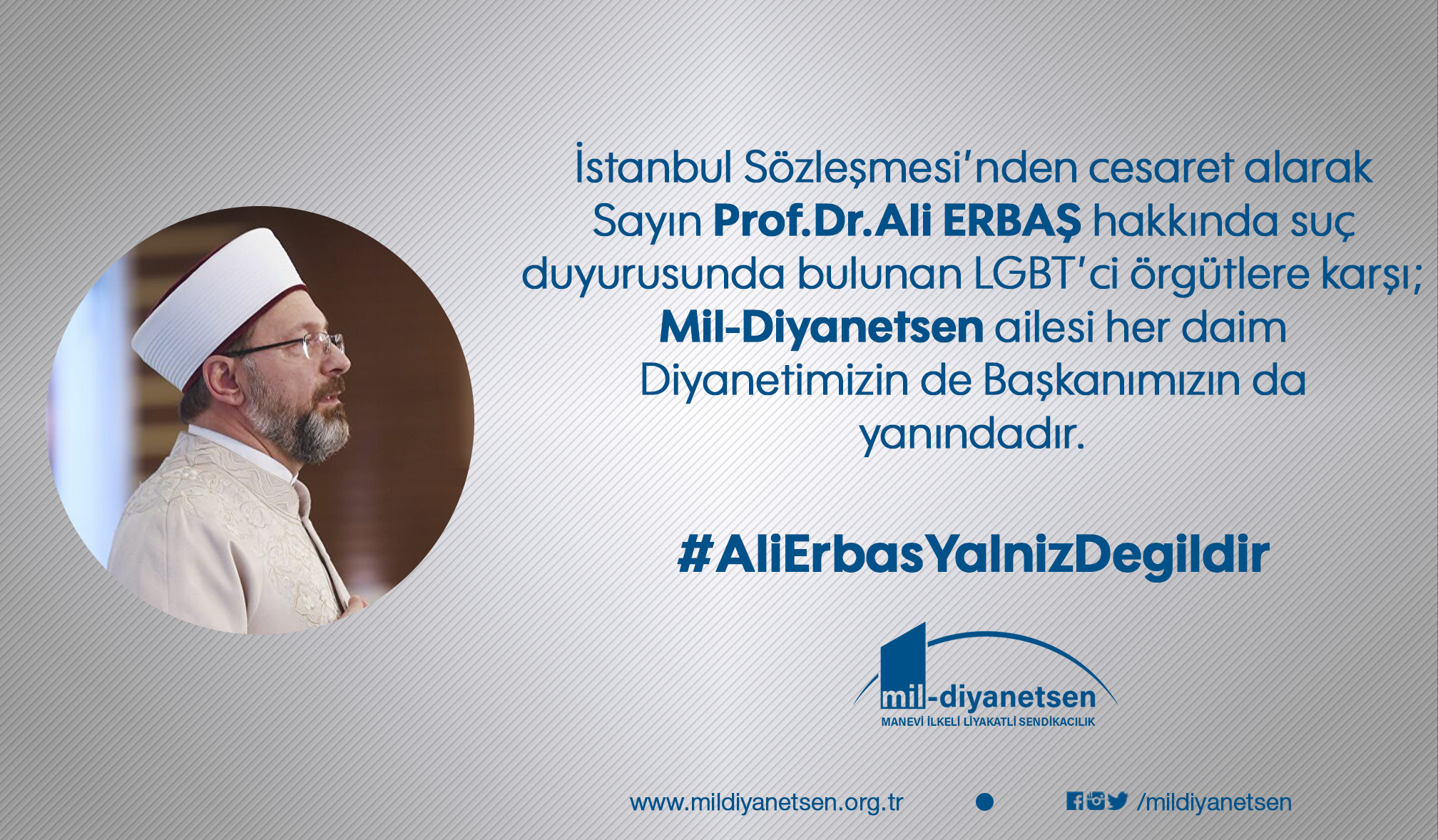Mil-diyanetsen ailesi olarak tüm üyelerimizle birlikte Muhterem Diyanet İşleri Başkanımız Prof. Dr. Ali ERBAŞ Hocamızın 24.4.2020 tarihinde hutbe irad ederken kullanmış olduğu ifadelerin her bir harfine aynen katılarak #AliErbaşYanlızDeğildir diyoruz.